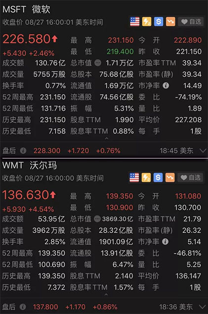 8月27日夜间,美股开盘后,微软股价直接(jie)拉升,一度冲高涨4.52%,截至收盘,微软股价涨逾2%。而沃尔玛股价也因此飙升,截至收盘,沃尔玛暴涨逾4%。不难看出,两家巨头股价暴涨的主要原因还是因为TikTok收购消息的发(fa)布(bu)。