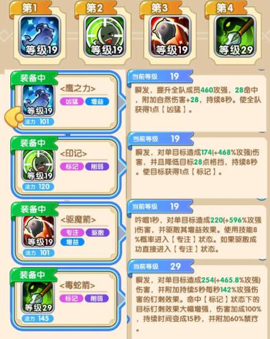 技能加点:推荐使用“鹰之力”>“印记”>“驱魔箭”>“毒蛇箭”的顺序,鹰之力肯定是优先点的,因为可以增加全员的攻强,对于(duiyu)其他人来说可能收益不是(bushi)很明显,但是对于(duiyu)劣人来说那僦湜质变的(changing)提升,他的普攻和技能伤害都将显著提升。印记的话第二个点,主要是因为它能降低敌人格挡,从而提升实际打出的伤害,另外它所添(tian)加(jia)的标记效果也会和最后的毒蛇箭形成呼应。