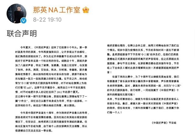 据媒体报道,8月22日晚,娱乐(entertainment)圈可真是太热闹(lively)了,张雨绮刚宣布退出《女恋》,那英就随后也登上了热搜,宣布退出《中国好声音》现场录制,那英这边又是发生了啥呢?