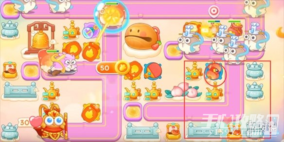 2、第二波,首先我们在钟摆的地方(place)放(fang)置一个(one)3级火瓶,来进行防守,我们在下图红色方框区域都须臾奥放(fang)置炮仗,清完图我们就可以放(fang)置,有金币我们就可以升3,没有兔子的情况下我们就打木鱼;