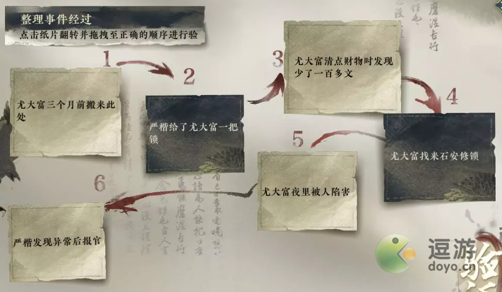 1、推理顺序:尤大富三个月前搬来此处——严楷给了尤大富一把锁——尤大富清点财务时发(fa)现(xian)少了一百文——尤大富找来石安修锁——尤大富夜里被人陷害——严楷发(fa)现(xian)异常(yichang)后报官