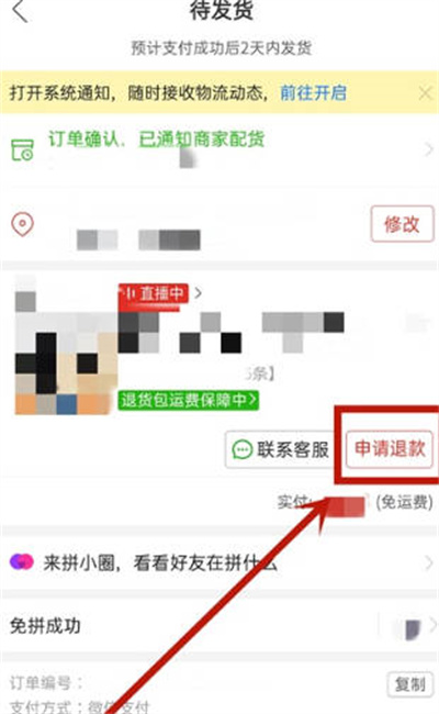 我(wo)们(men)点击了直接免拼之(zhi)后(hou),然后(ranhou)我(wo)们(men)在代发货页面中找到此订单,接着点击右下角申请(qing)退款即(ji)可。