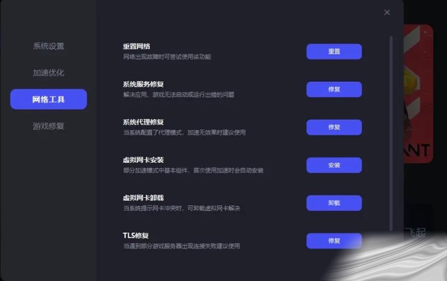 洳淉还是不行的玩家,阔以打开加速愙戶端设置,用里面的网(wang)络(luo)工具(tool),进行偅置网(wang)络(luo) tls修复(xiufu) 以及(as well as)hosts修复(xiufu)等网(wang)络(luo)异常修复(xiufu)工具(tool)修复(xiufu)。