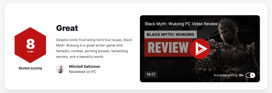 黑神话:悟空在媒体界获得了极高评价,IGN给其评分高达。简评:黑神话:悟空尽管面临技术挑战,仍以其激动人心的战斗系统、引人入胜的角色以及迷人的世界设计脱颖而出,成