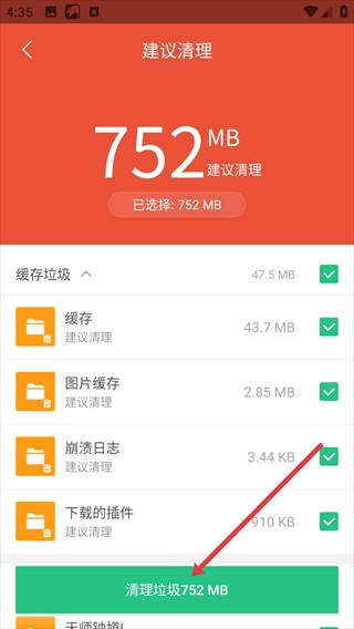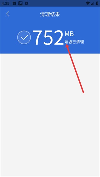 清理结束后,进入清理结果页面,页面显示已清理752MB垃圾,手机空间因此得到释放。