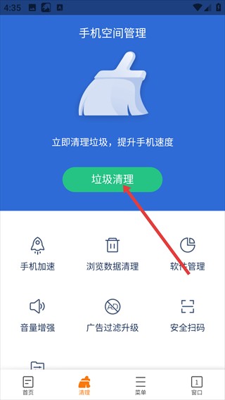 在软件启动后,只需轻点底部“清理”按钮,即可轻松访问手机空间管理页面,体验全面的垃圾文件整理功能。